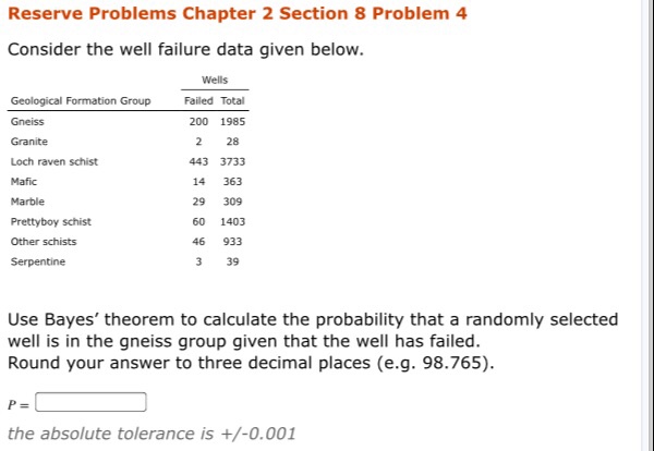 Wells geological formation group gneiss granite loch raven schist mafic marble prettyboy schist other schists serpentine failed 140 2 443 14 26 60 46 3 total 1685 28 3733 363 309 1403 933 39 let a denote the event that the geological formation of a well has more than 1000 wells let b denote the event.