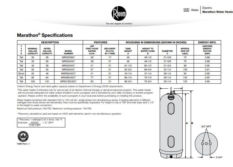Marathon water heater spec sheet.